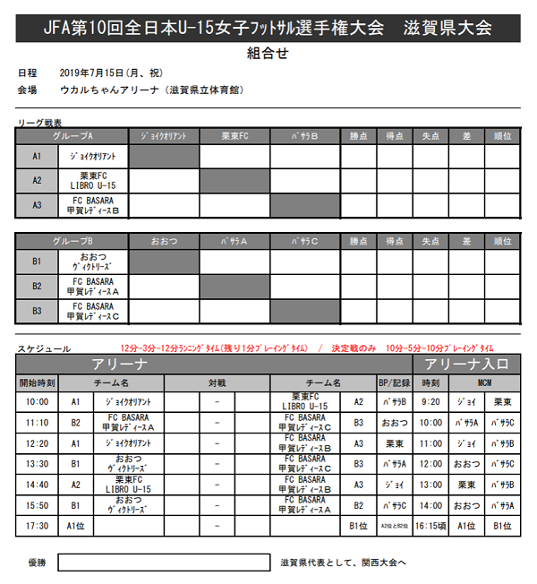 滋賀少年サッカー応援団 みんなのnews 組合せ掲載 Jfa第10回 全日本u 15女子フットサル選手権大会 滋賀県大会