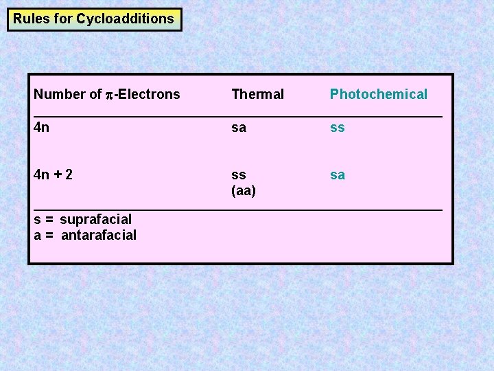 Frontier Molecular Orbital Theory for Cycloaddition Reactions Frontier Molecular Orbital Theory (FMO Theory) Number of Pi Electrons Thermal Photochemical 4n 2 (Odd # of Pairs) SupraSupra Allowed SupraAntara ForbiddenThe stereochemistry of pericyclic cycloadditions Reading Mode Steve Bachrach has blogged on the reaction shown below If it were a pericyclic cycloaddition, both new bonds would form simultaneously, as shown with the indicated arrow pushing Ten electrons would be involved, and in theory, the transition state would have 4n2 aromaticityA cheletropic cycloaddition is a reaction that occurs in which both new bonds are formed to the same atom on one of the reactants The classic example of